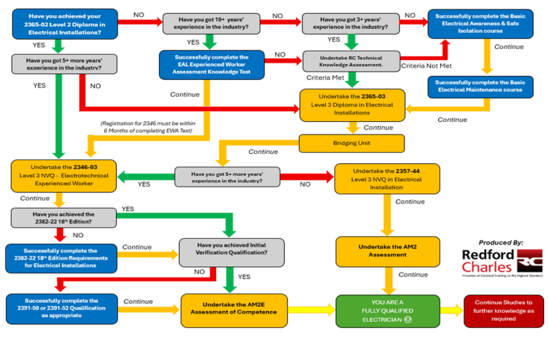 This flowchart explains the steps and necessary completion of qualifications and assessments required to become a qualified electrician: